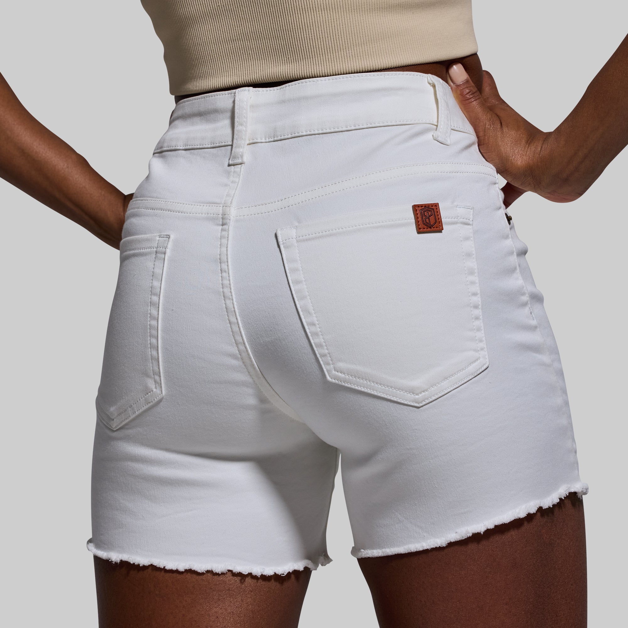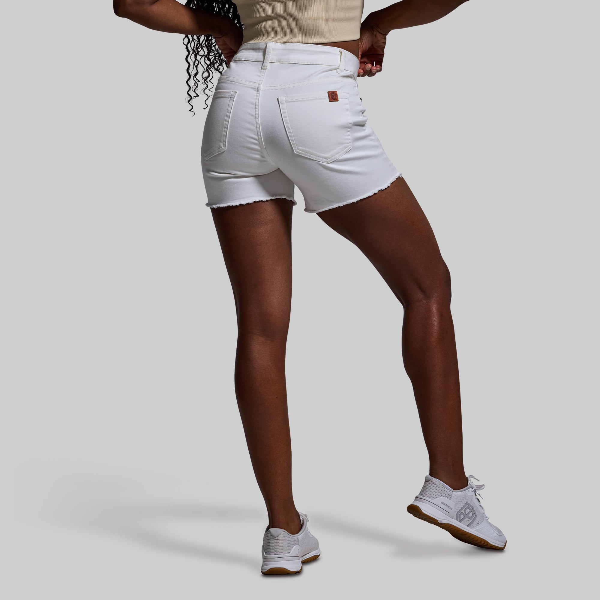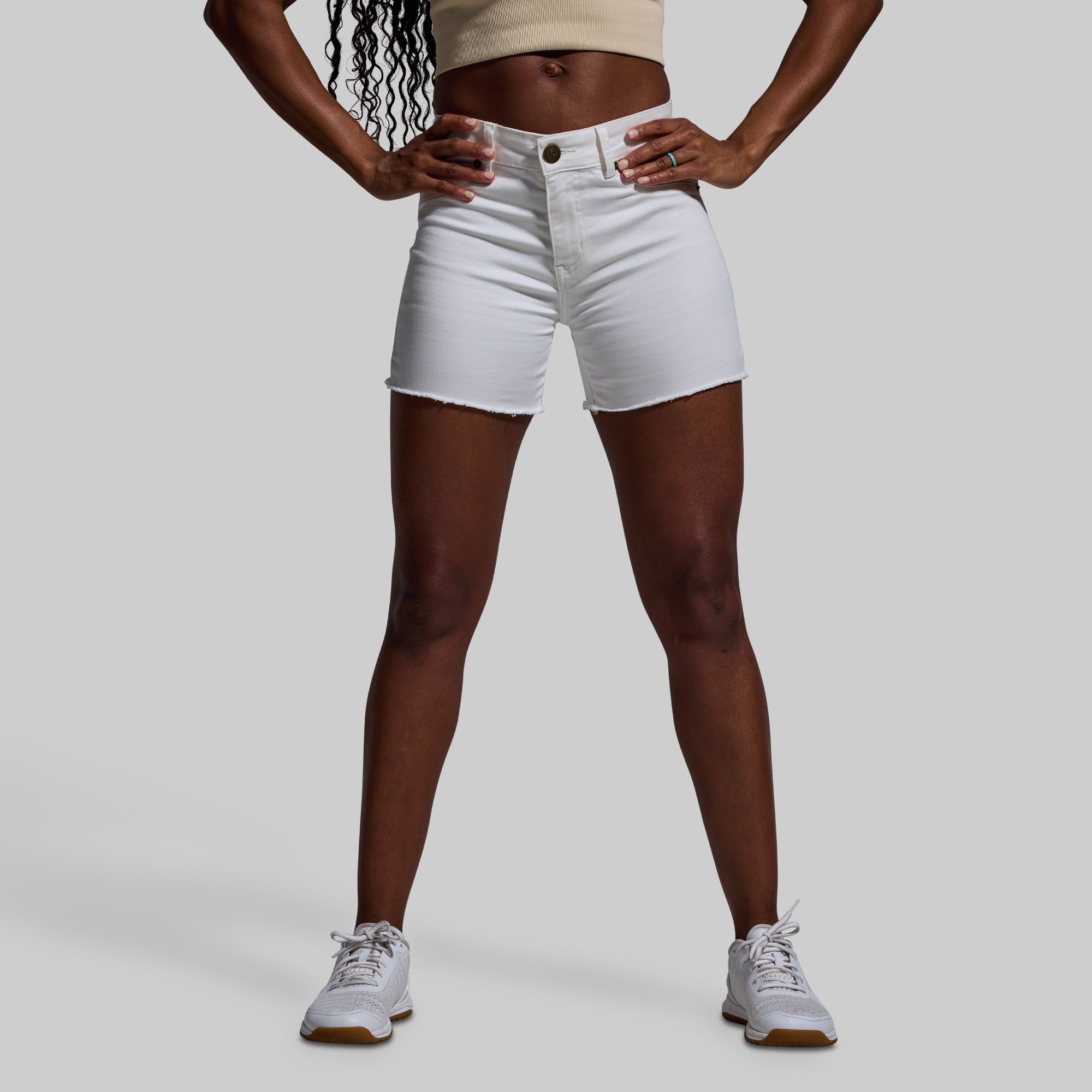 Athletic builds and denim often struggle to get along. but not anymore. Meet the FLEX Stretchy Jean Short- the ultimate jean short made for muscular women. Crafted from our soft. yet durable?stretchFLEX fabric. these mid-rise jean shorts are made with 4-way stretch so they fit snugly around strong thighs and glutes without leaving a waist gap. Other features include a fringe hem that can be worn as is or cuffed. and two back pockets.?