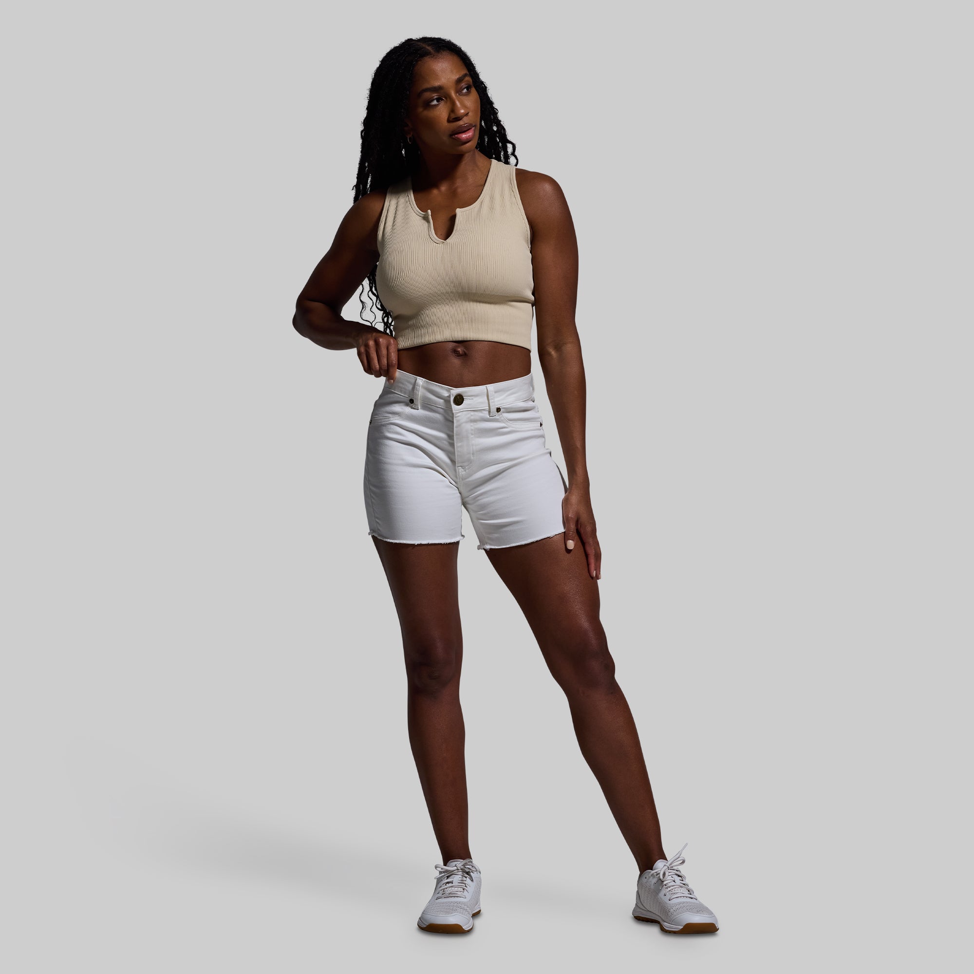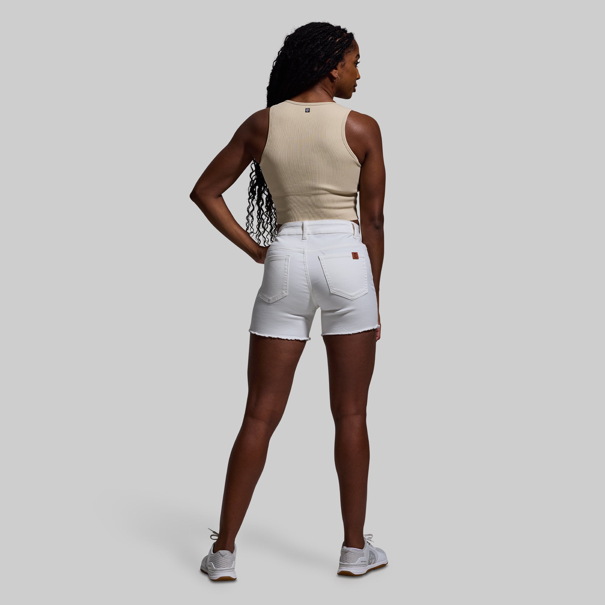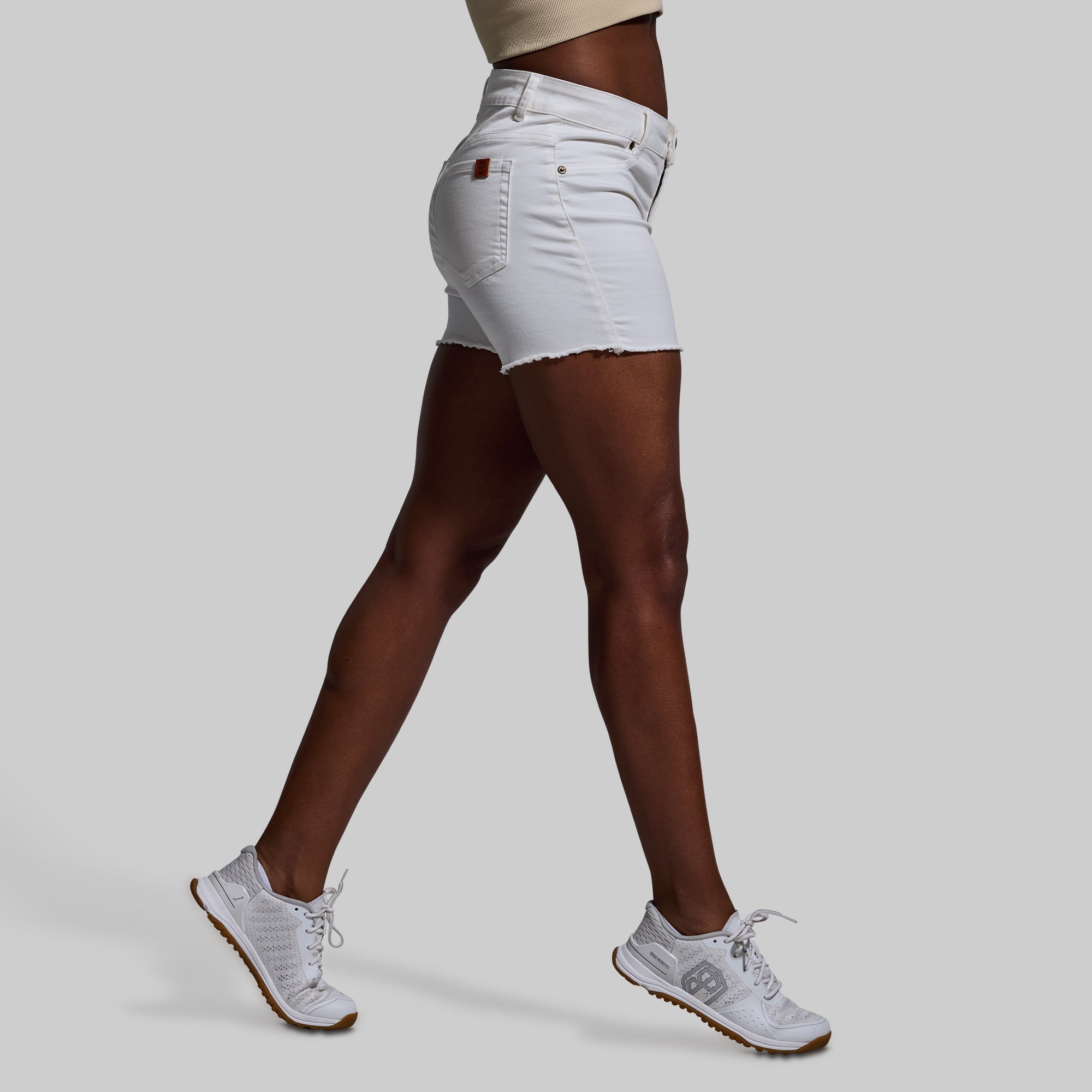 Athletic builds and denim often struggle to get along. but not anymore. Meet the FLEX Stretchy Jean Short- the ultimate jean short made for muscular women. Crafted from our soft. yet durable?stretchFLEX fabric. these mid-rise jean shorts are made with 4-way stretch so they fit snugly around strong thighs and glutes without leaving a waist gap. Other features include a fringe hem that can be worn as is or cuffed. and two back pockets.?
