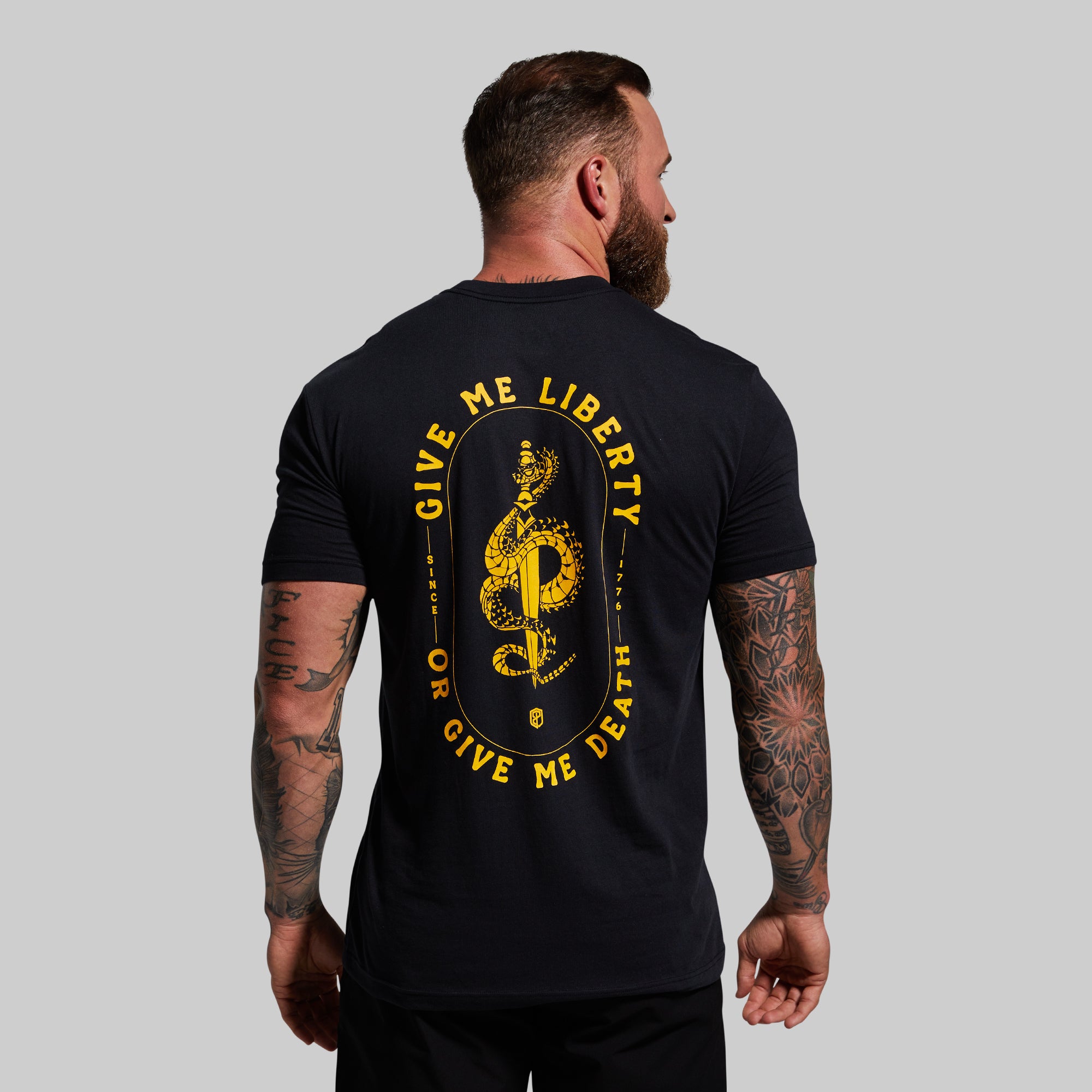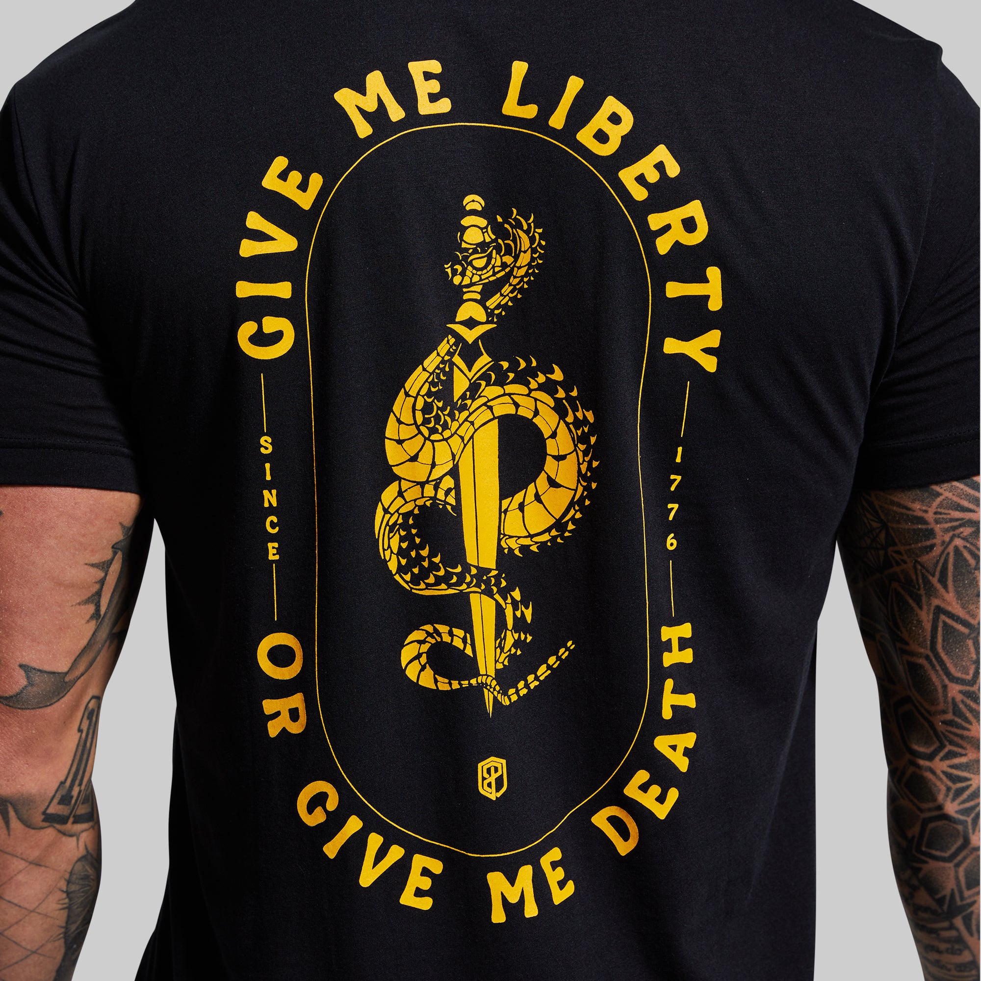 This ultra soft sueded tee in?Black features Give Me Liberty or Give Me Death quote.